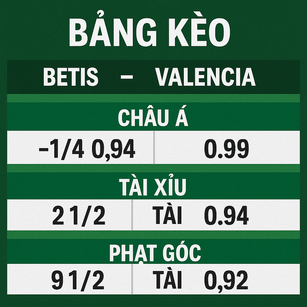 - Phân tích: Dù Betis được đánh giá nhỉnh hơn sân nhà, nhưng 4 lần gặp gần nhất đều hòa. Valencia đang có lối chơi phòng ngự phản công rất khó chịu.