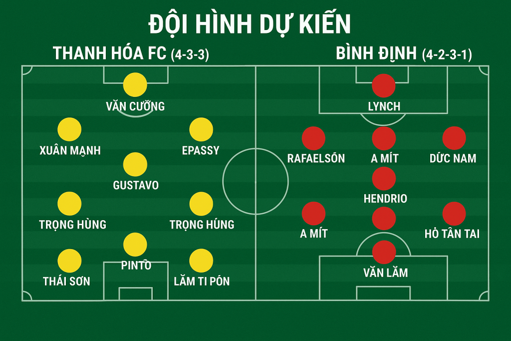 🟨 Thanh Hóa FC (4-3-3): Văn Cường – Xuân Mạnh, Epassy, Gustavo, Đình Hưng – Thái Sơn, Pinto, Trọng Hùng – Paulo Henrique, Bruno, Lâm Ti Phông