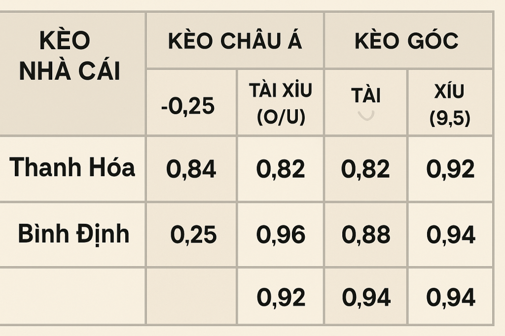 | Kèo châu Á | Thanh Hóa -0.25 |