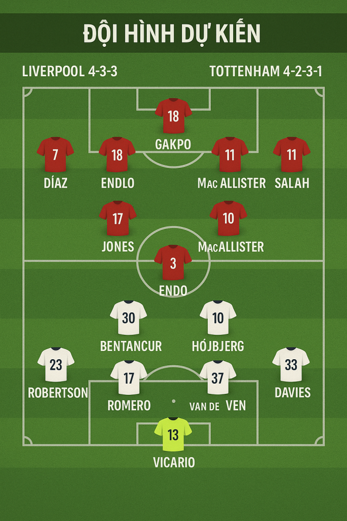 - Kịch bản trận đấu: Liverpool chủ động dồn ép ngay từ đầu, Spurs phản công nhanh nhưng thiếu chính xác.