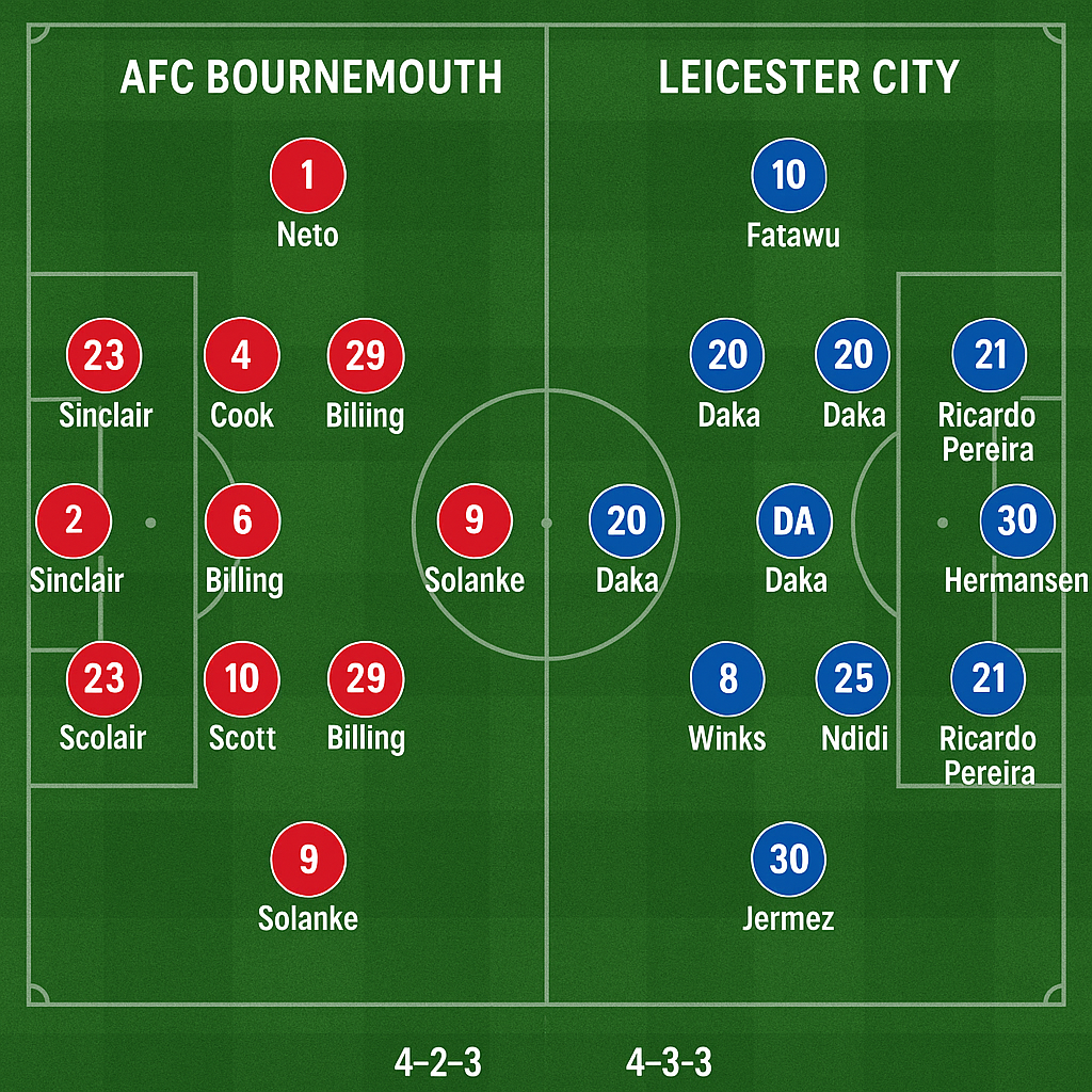 - Bournemouth (4-2-3-1): Neto – Smith, Zabarnyi, Kelly, Kerkez – Billing, Lerma – Tavernier, Christie, Sinisterra – Solanke