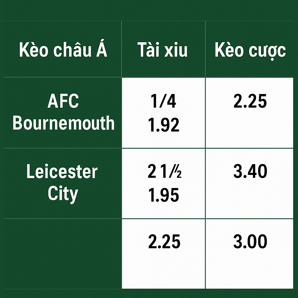 - Phân tích: Leicester đá sân khách yếu, hàng thủ dễ vỡ trận cuối mùa. Bournemouth lại có lợi thế sân nhà và động lực rõ ràng.